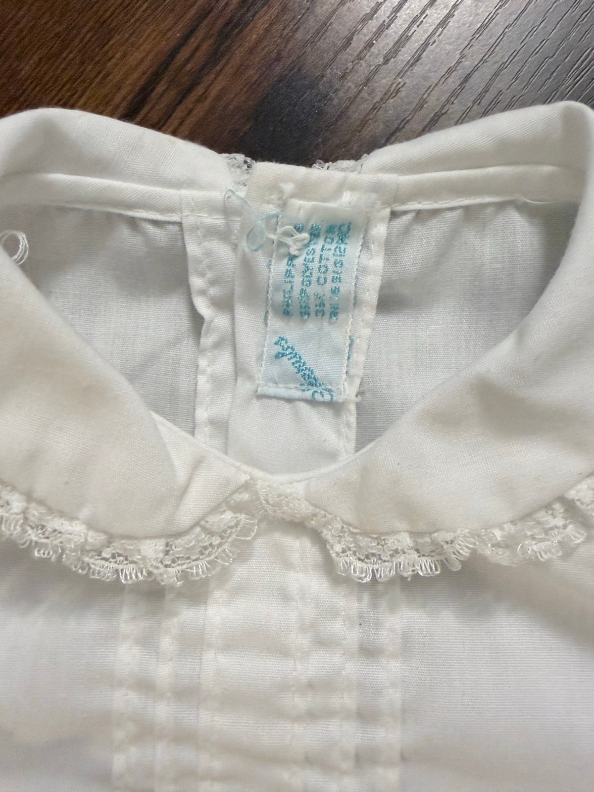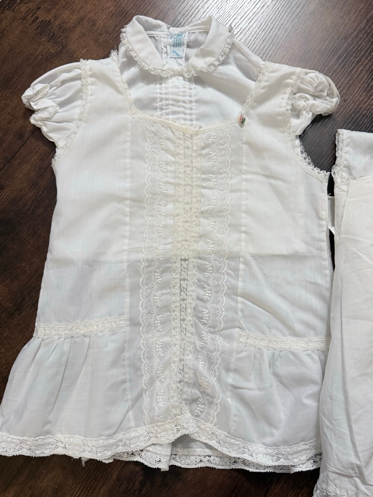 The garments appear to be in very good vintage condition. There is some faint yellowing or 'foxing' visible on the back of the larger gown, which is common for textiles stored for decades. The lace edges appear remarkably intact without the usual fraying. The presence of the original labels adds to the historical context.