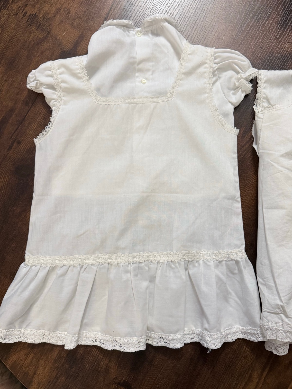 A classic three-piece set of infant 'Sunday best' clothing, featuring a gown with a Peter Pan collar, a matching sleeveless pinafore, and a simple slip.