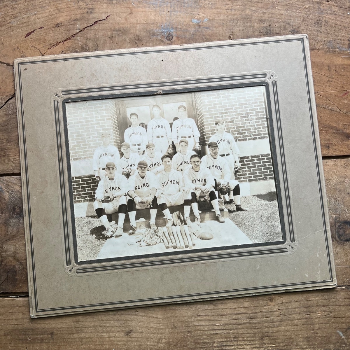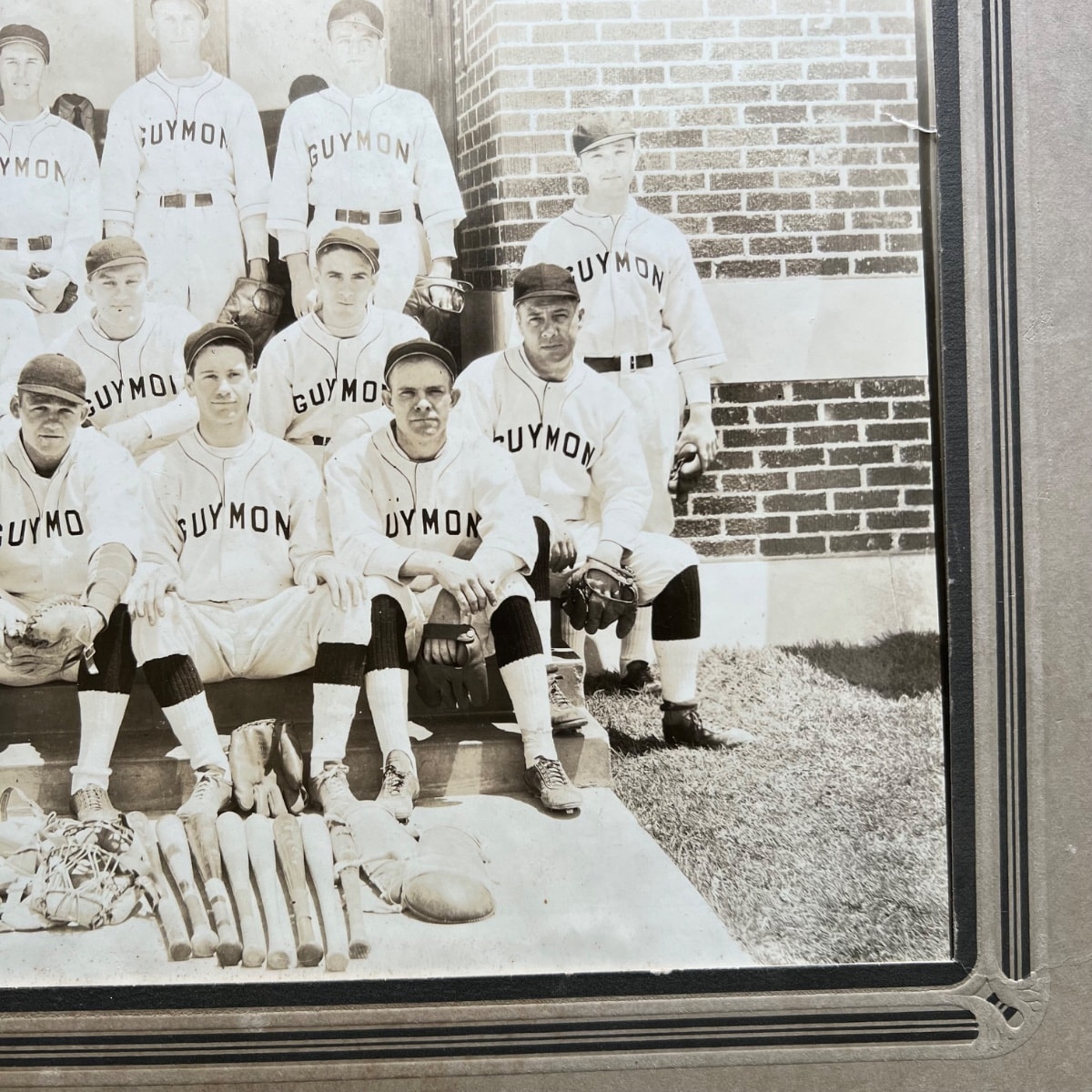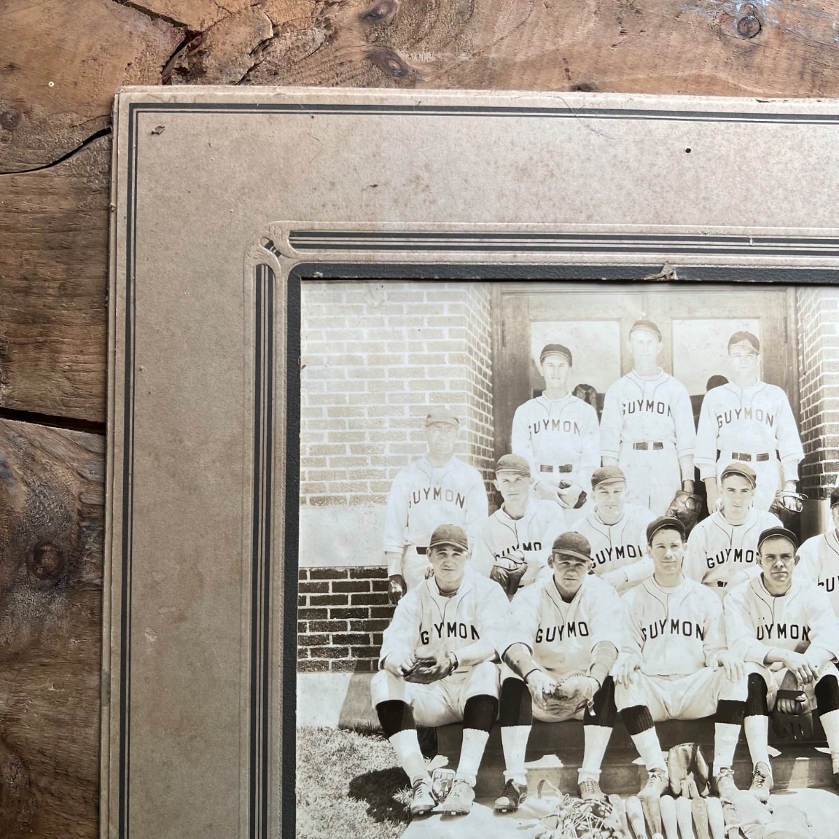 The photo itself shows excellent tonal range and clarity. The matting has some minor corner wear and light foxing/staining consistent with age, but the image remains protected. Condition is very good for its age. Value is driven by the 'cross-collectible' appeal to baseball historians and Oklahoma regional collectors.