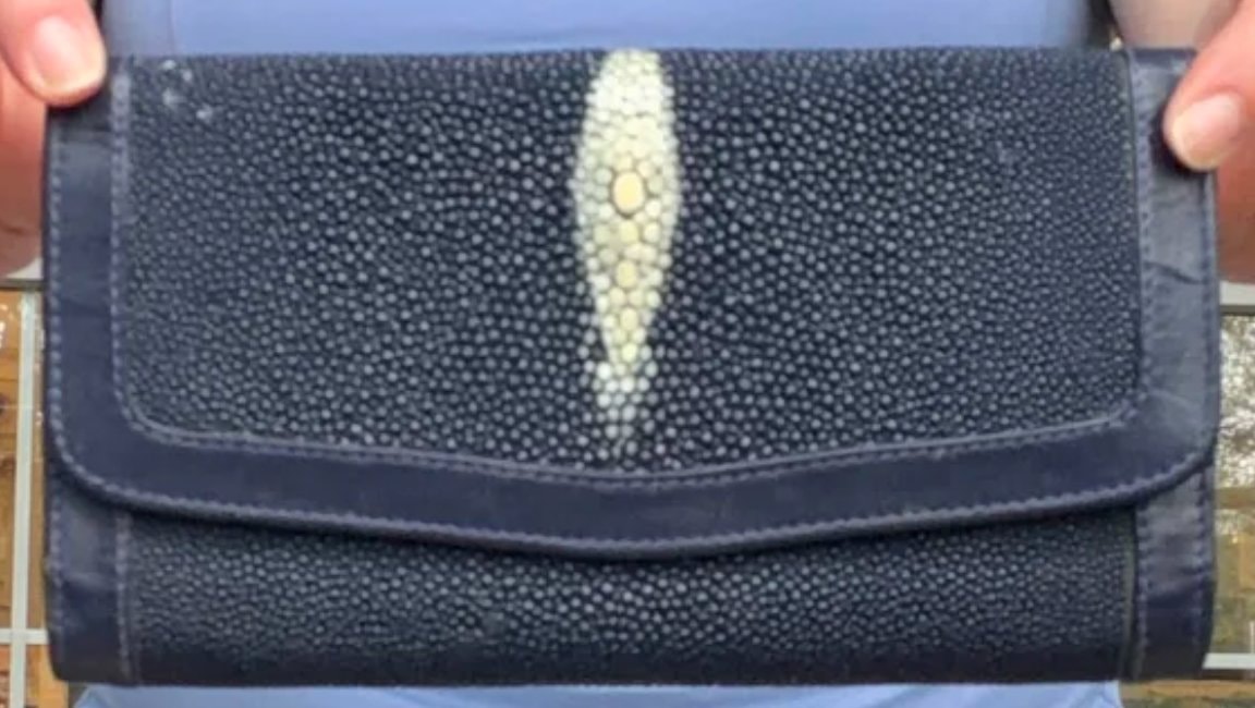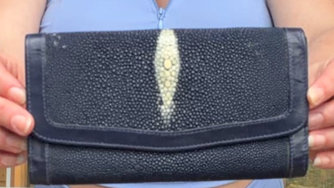This is a luxurious clutch wallet crafted from genuine stingray skin, featuring the iconic 'white eye' or 'diamond crown' at its center. Known as shagreen or galuchat, this material is celebrated for its shimmering, pebbled texture and extraordinary durability.