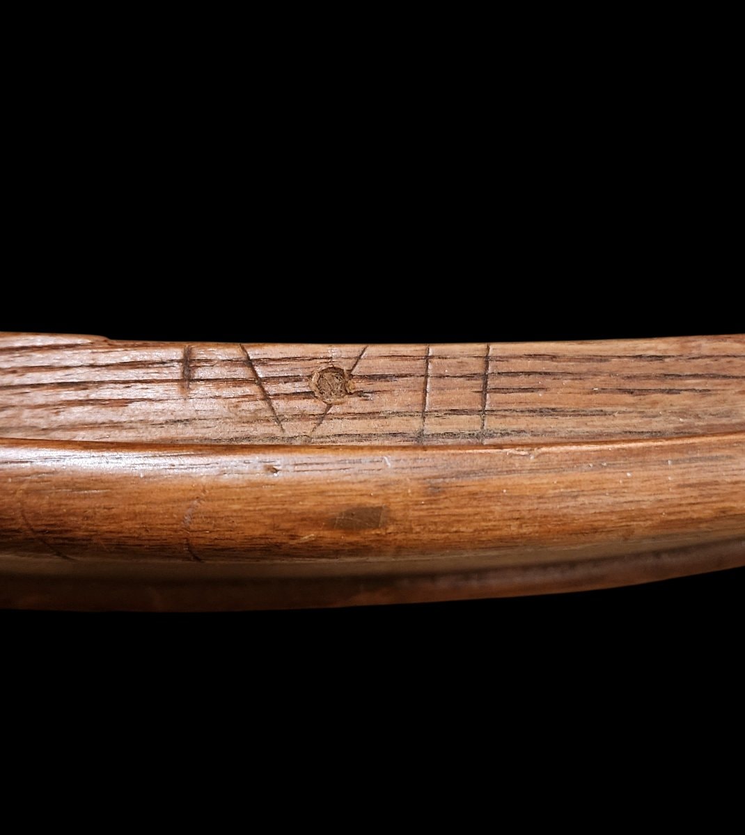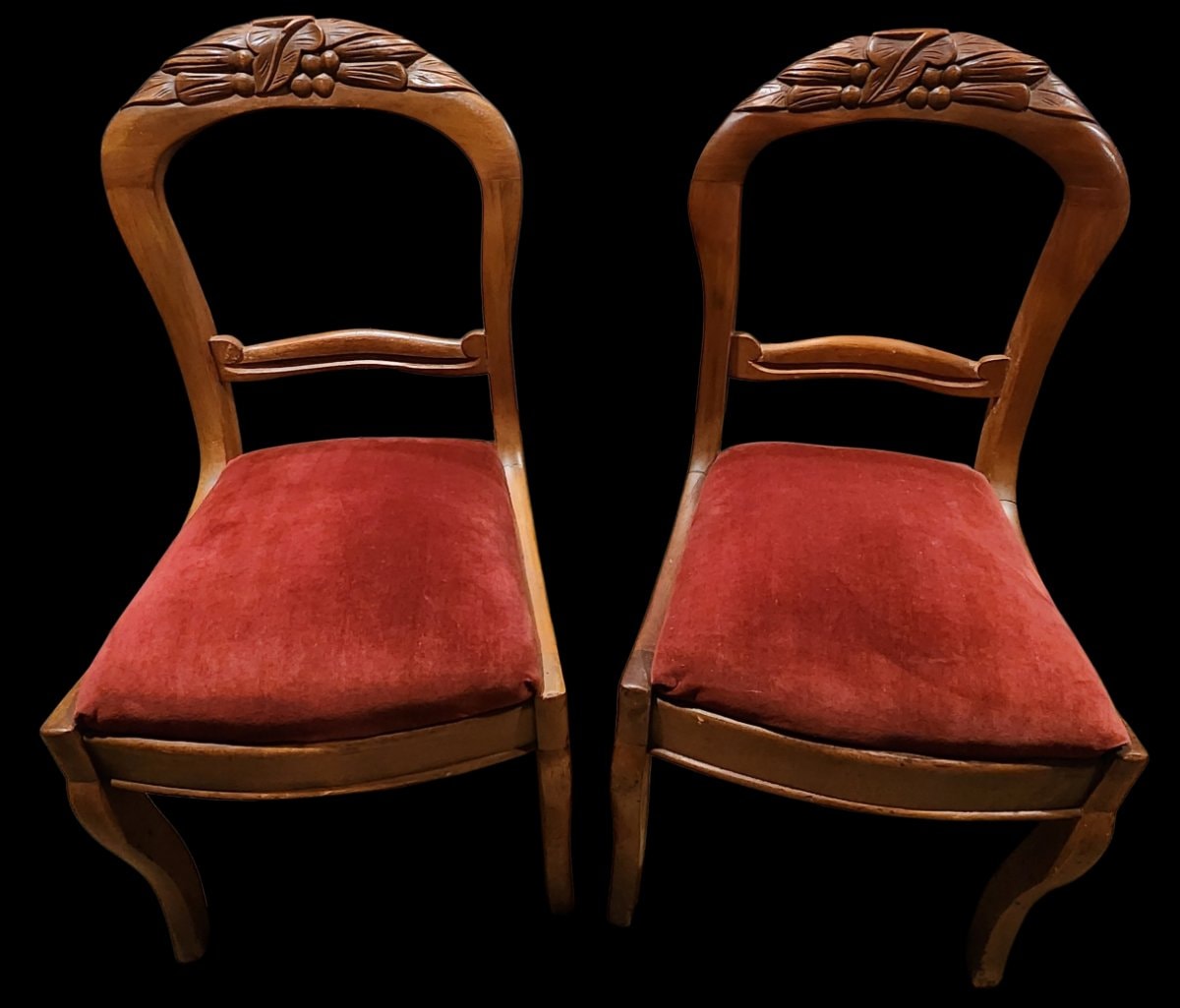 The frames appear structurally sound with a warm patina, though there is expected light scuffing on the legs consistent with age. The red velvet upholstery is a later replacement but is in clean, functional condition. The presence of the original joiner's marks is a wonderful sign of authenticity.