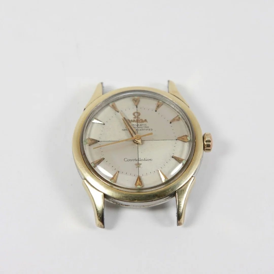 mediumVintage Omega Constellations, particularly those with desirable pie-pan dials, are frequently subject to 'redials' (refinished dials) or assembled from mismatched parts (Frankenwatches). While the external configuration appears correct for a 1950s model, the lack of movement and inner caseback photos prevents confirming that the caliber, dial, and case reference match factory specifications. Authentication of the dial finish and movement is highly recommended before a high-value sale.