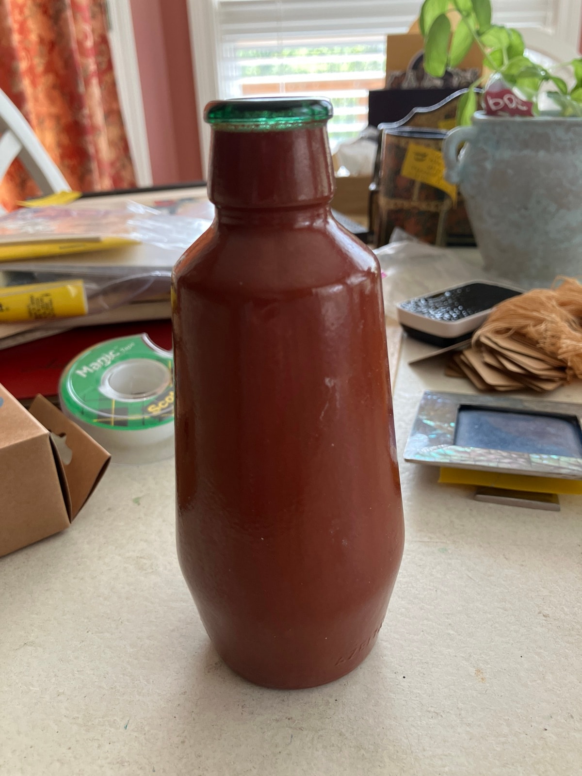 A rare and tactile presentation bottle for Lazzaroni Amaretto, featuring a red terracotta body with a fused green glass rim. This hybrid construction combines traditional Italian pottery with functional glasswork to preserve the liqueur's delicate almond flavor.