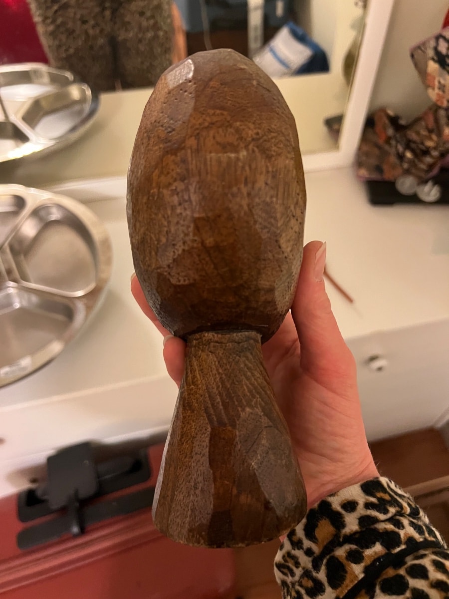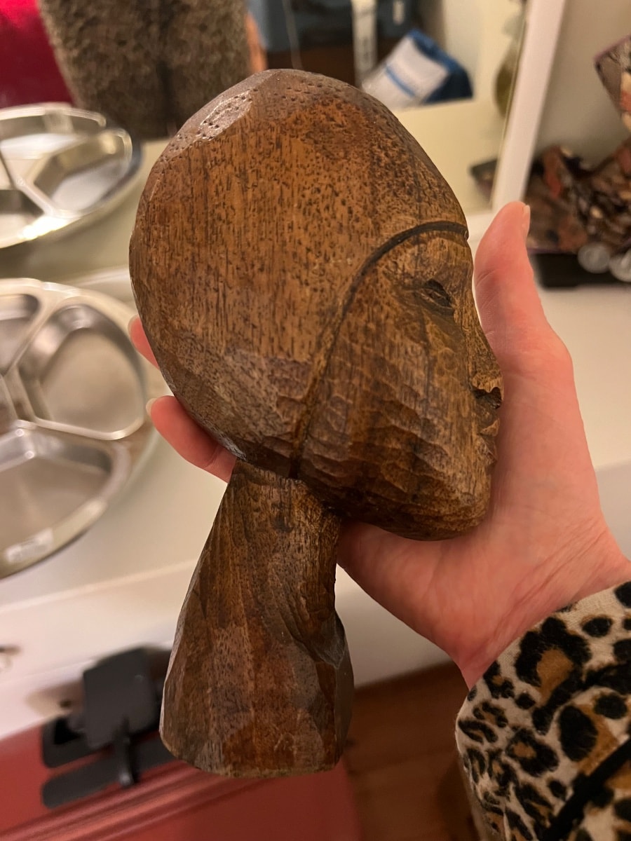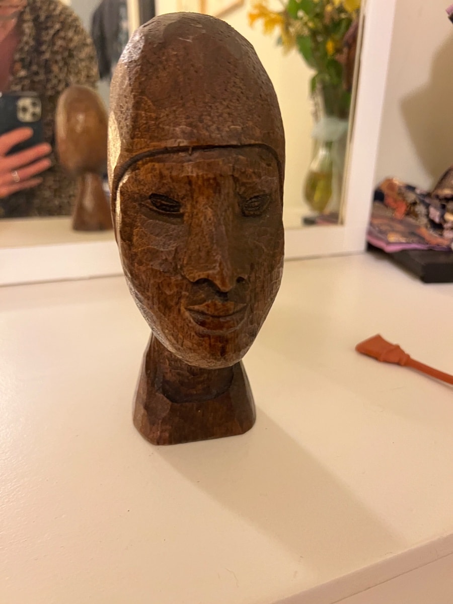 A hand-carved wooden bust featuring a stylized face with a distinctive cap-like hairstyle and visible chisel marks. This piece represents the mid-century fascination with 'primitivism' and the tactile beauty of natural wood grain.