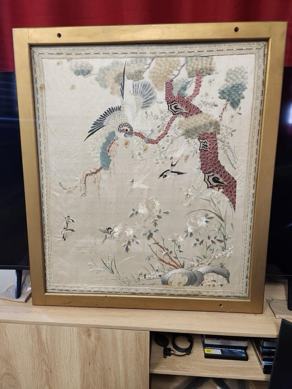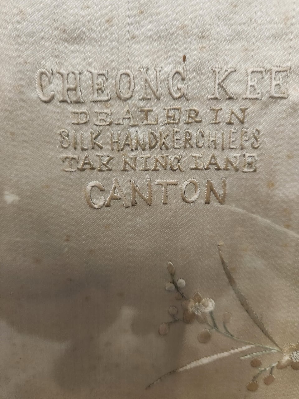During the Late Qing Dynasty, Canton was the exclusive gateway for Western trade, producing highly coveted luxury textiles for the global market. The survival of the English-language retailer tag highlights the intense, localized mercantile culture of Guangzhou's treaty port era.
