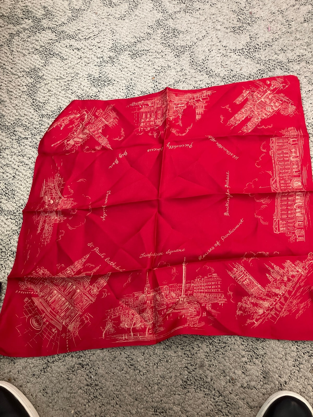 Post-war London saw a boom in 'commemorative textiles' as travel became accessible again. This scarf served as a wearable map for a visitor navigating a city rebuilding itself, turning landmarks into high fashion.
