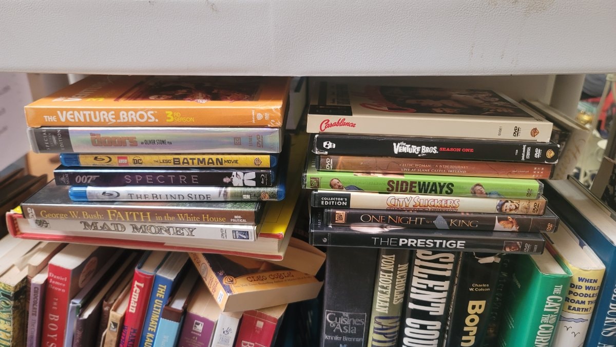 A diverse assortment of physical media representing the peak of the DVD era and the transition to high-definition Blu-ray.