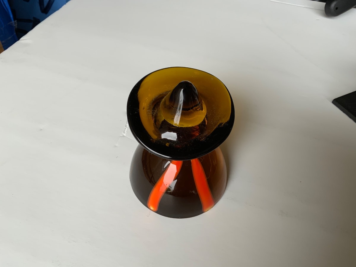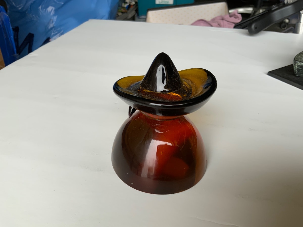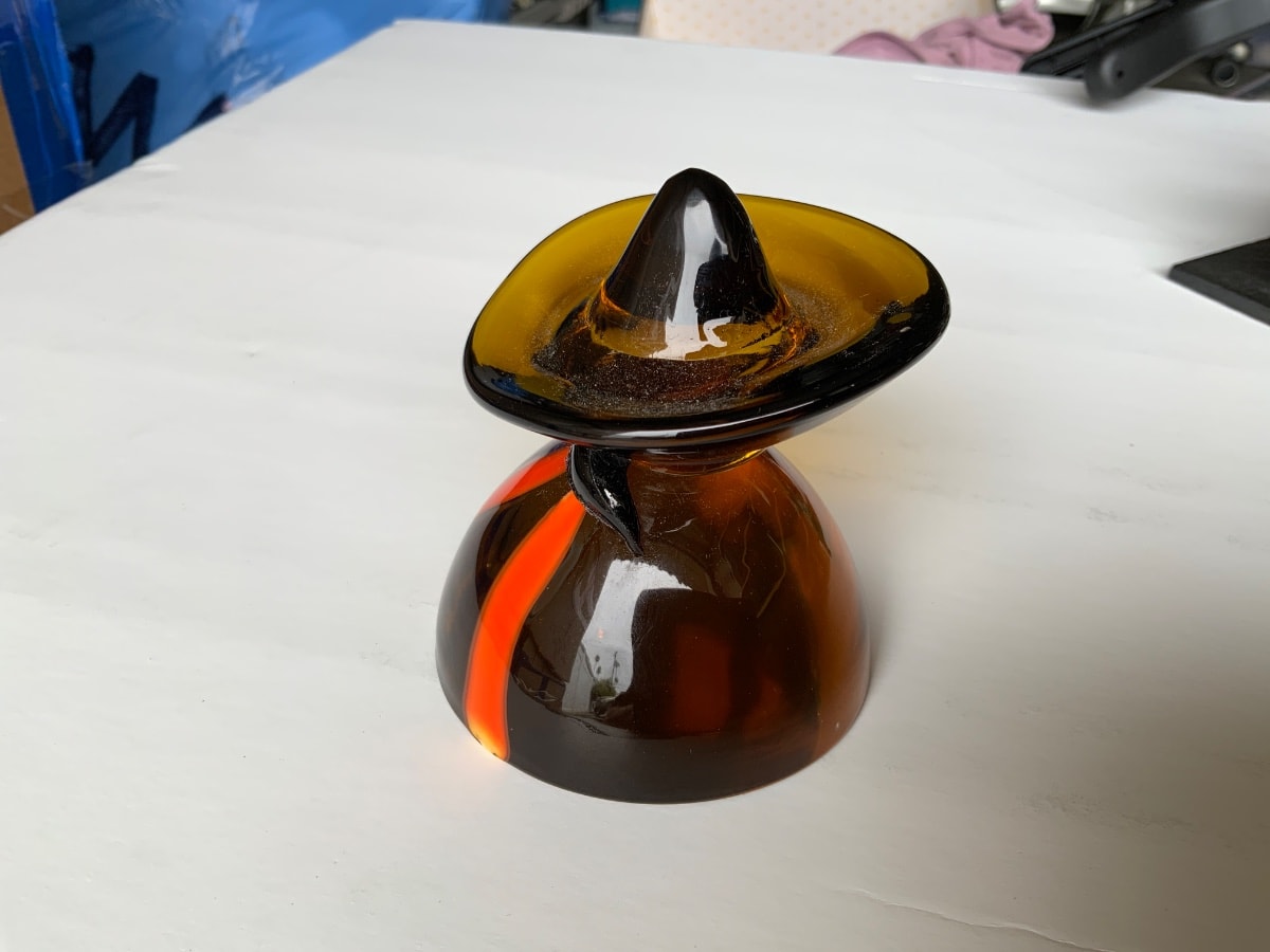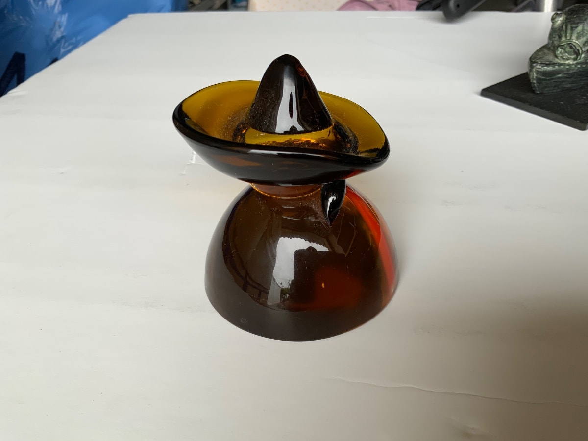 The glass appears to be in excellent vintage condition with no visible chips or 'flea bites' on the delicate brim of the hat. The clarity of the amber glass suggests it has been kept out of harsh sunlight, which can sometimes dull the surface over decades. Excellent condition is vital for glass collectors.