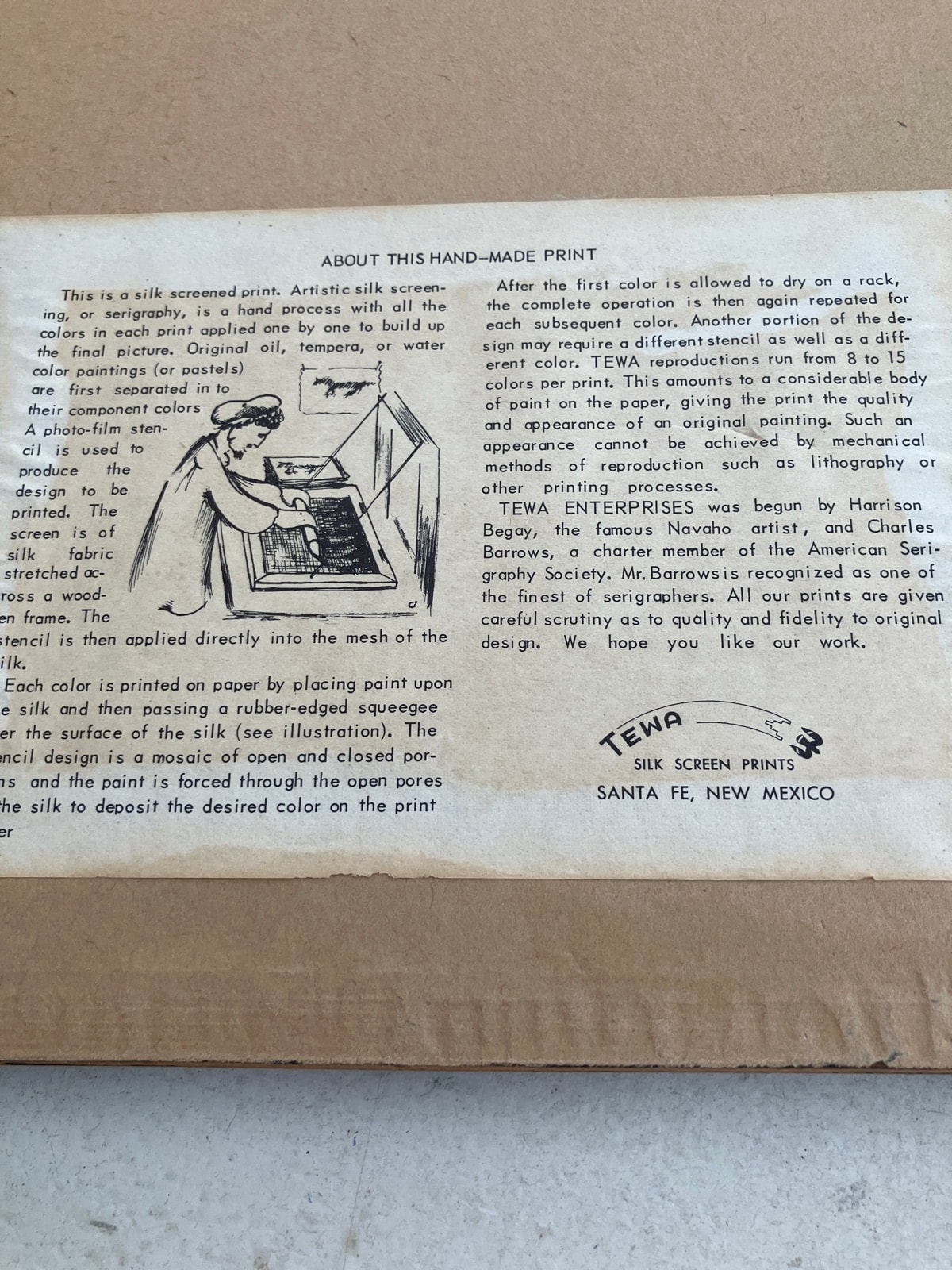 The print shows light toning (yellowing) and some visible 'waving' in the paper, which is common for vintage Tewa prints. The original Tewa Enterprises label on the reverse adds significant provenance and historical value. Condition is good, but acid-free re-matting is recommended for preservation.