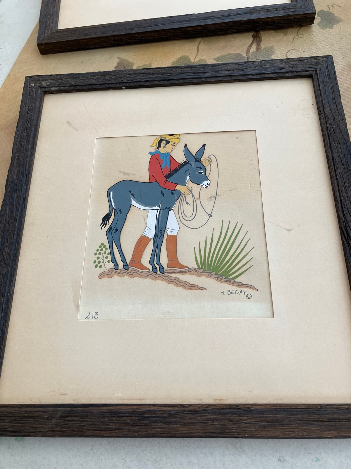 A classic mid-century hand-pulled serigraph by renowned Navajo artist Harrison Begay, featuring a young boy in traditional attire leading a donkey. This piece exemplifies the 'Studio Style' of Native American art, defined by its flat color fields, delicate line work, and serene, idealized subject matter.