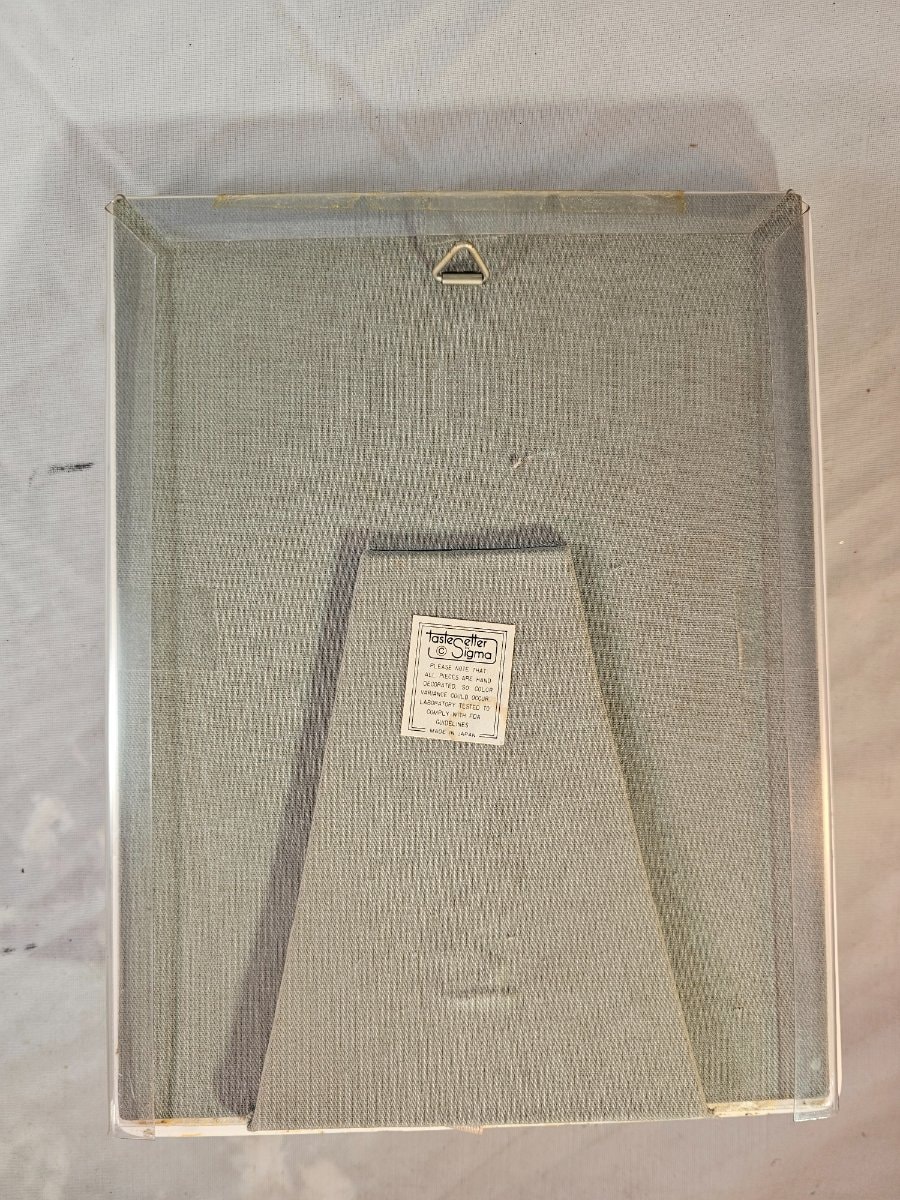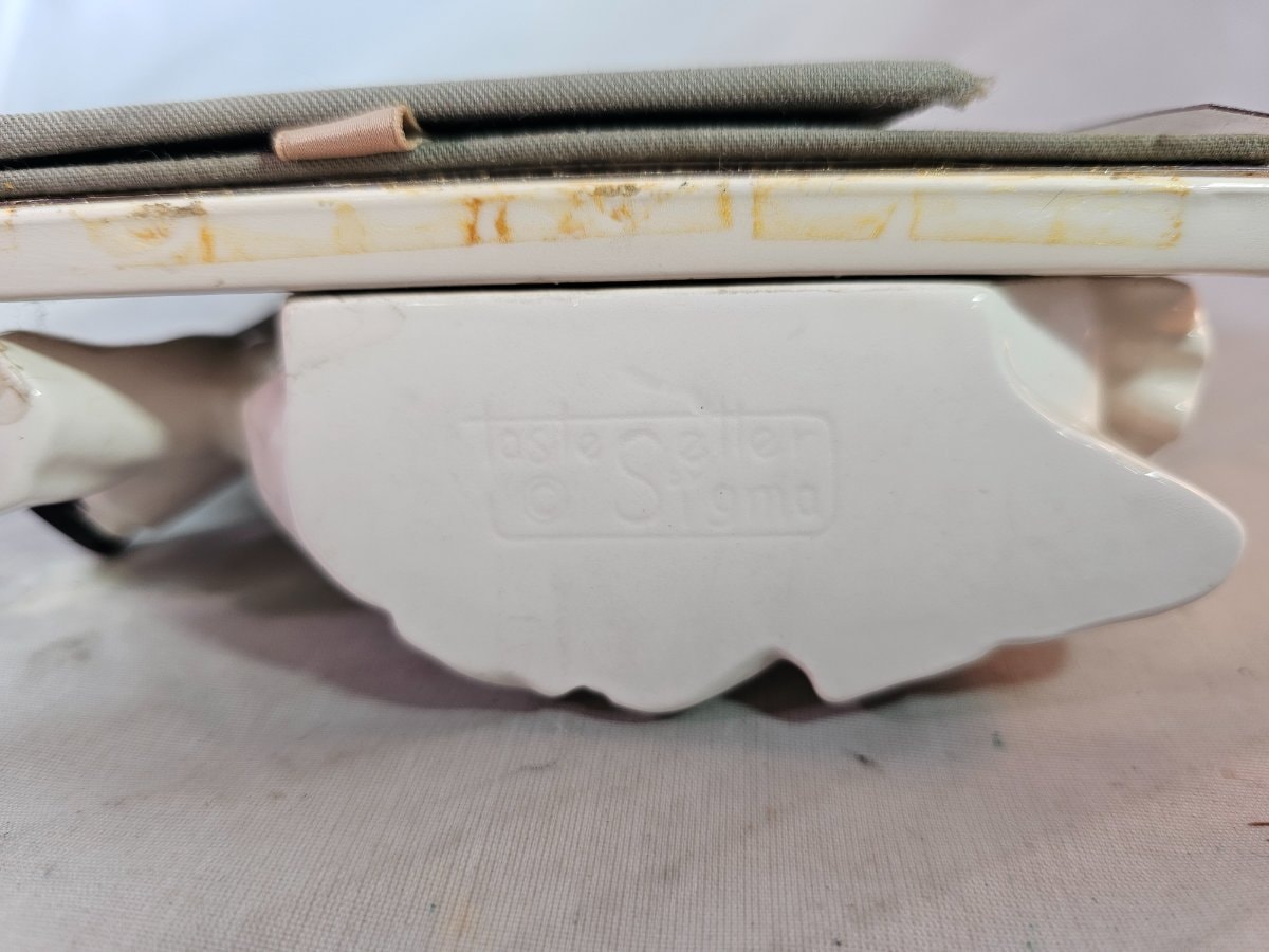 The ceramic appears structurally sound with no visible chips to the delicate ruff or feet. However, there is significant yellowed adhesive residue along the top edge of the frame that will require careful cleaning. The presence of this residue and any potential glaze staining slightly tempers the value.