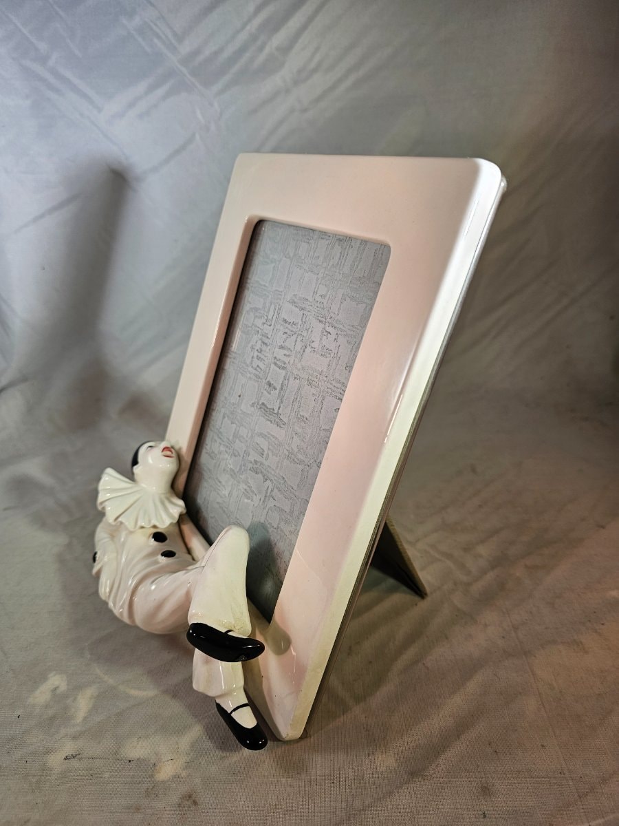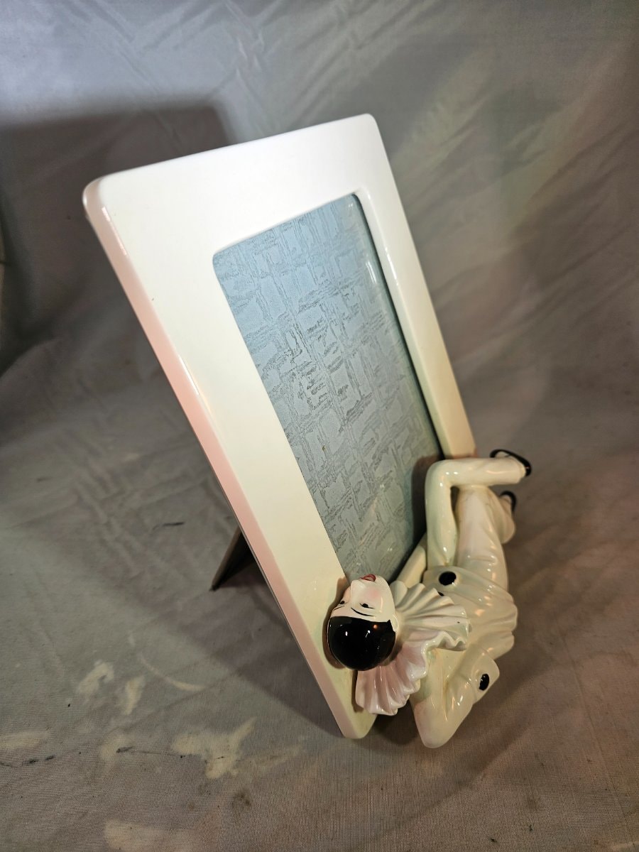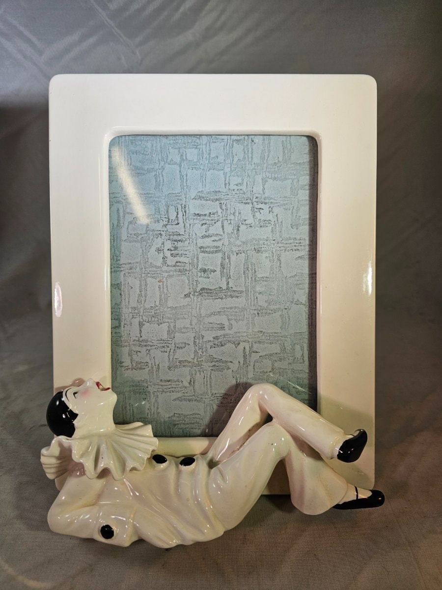 This whimsical ceramic picture frame features a reclining Pierrot clown, a classic character from French pantomime, draped elegantly across the base. The high-gloss white glaze is accented with hand-painted black details and soft pink blushing, characteristic of the 'clowncore' aesthetic that dominated 1980s interior design.