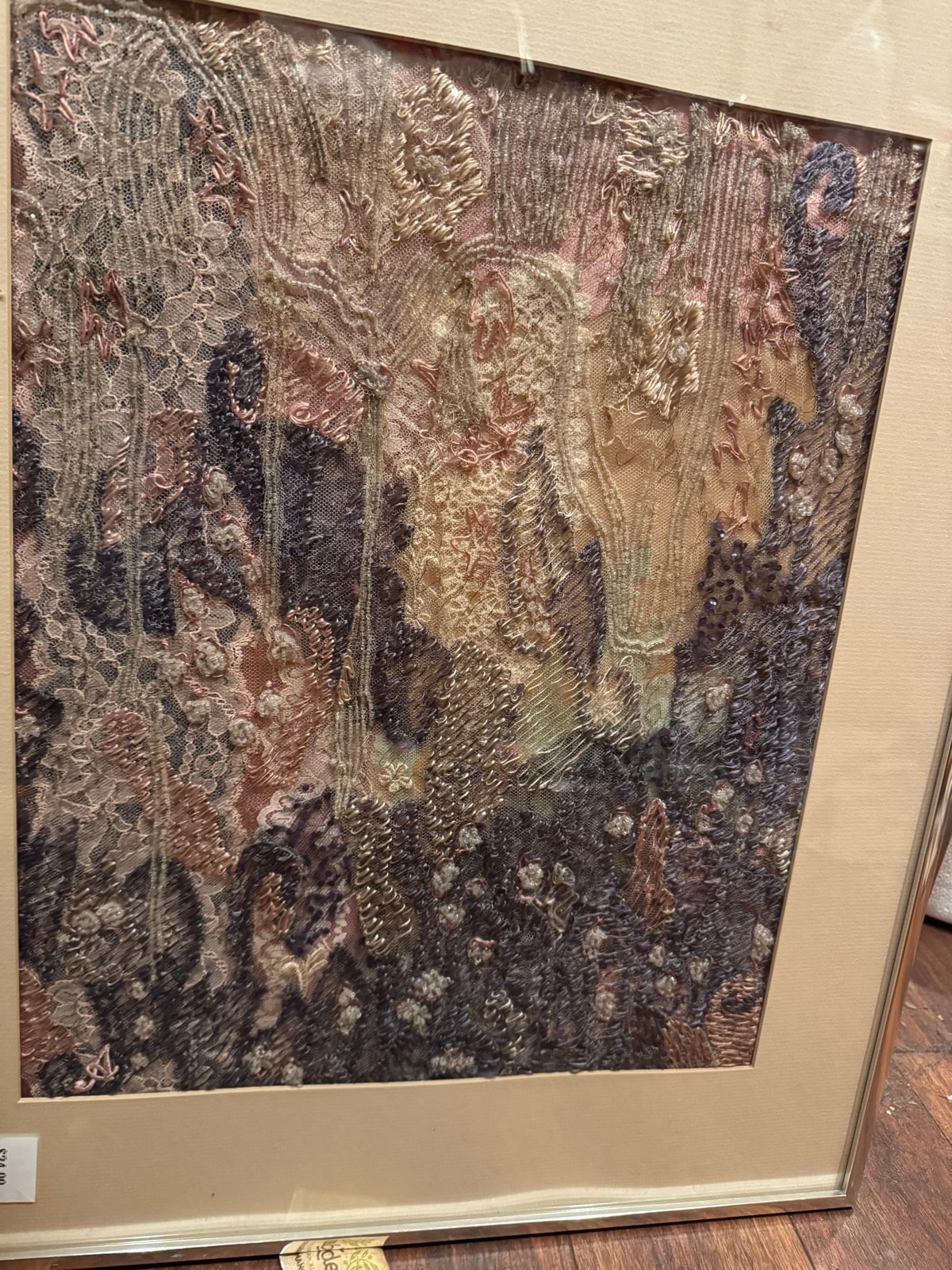 The piece appears to be in excellent condition, well-preserved behind glass which has protected the delicate fibers from dust and UV damage. The frame shows minor wear consistent with age, but the textile itself remains vibrant and intact. Excellent preservation of the metallic threads adds to the value.
