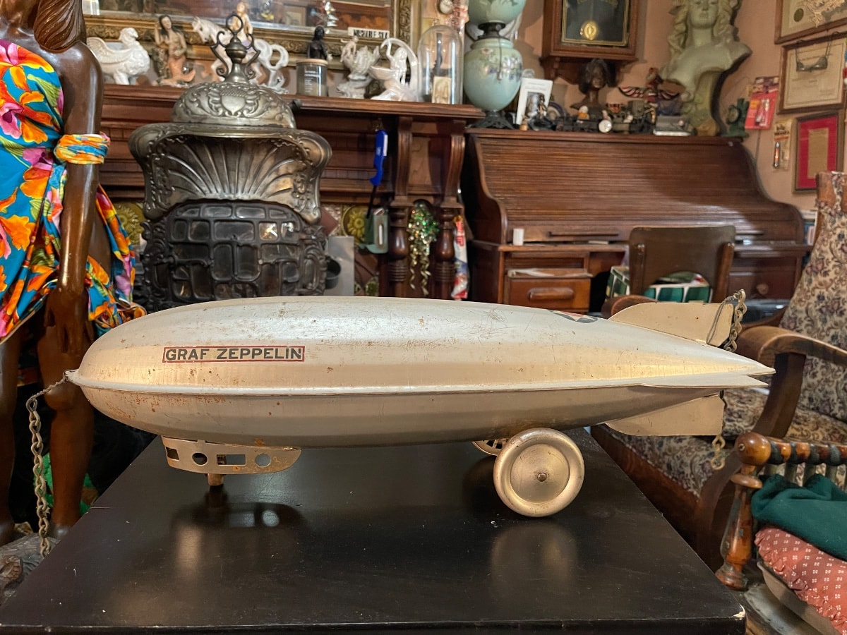 A classic American pressed steel pull toy modeled after the LZ 127 Graf Zeppelin, the most successful hydrogen-filled airship in history.