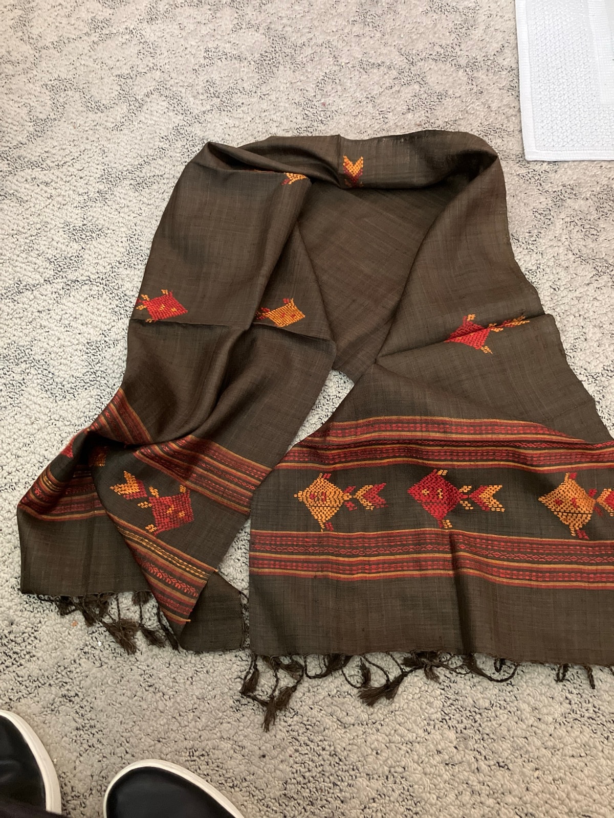 The textile appears to be in excellent condition with no visible snags or staining. The natural variations in the weave are characteristic of hand-loomed silk and do not detract from the value. Excellent preservation of the fringe. Value is driven by the labor-intensive hand-weaving process and the use of Eri silk.