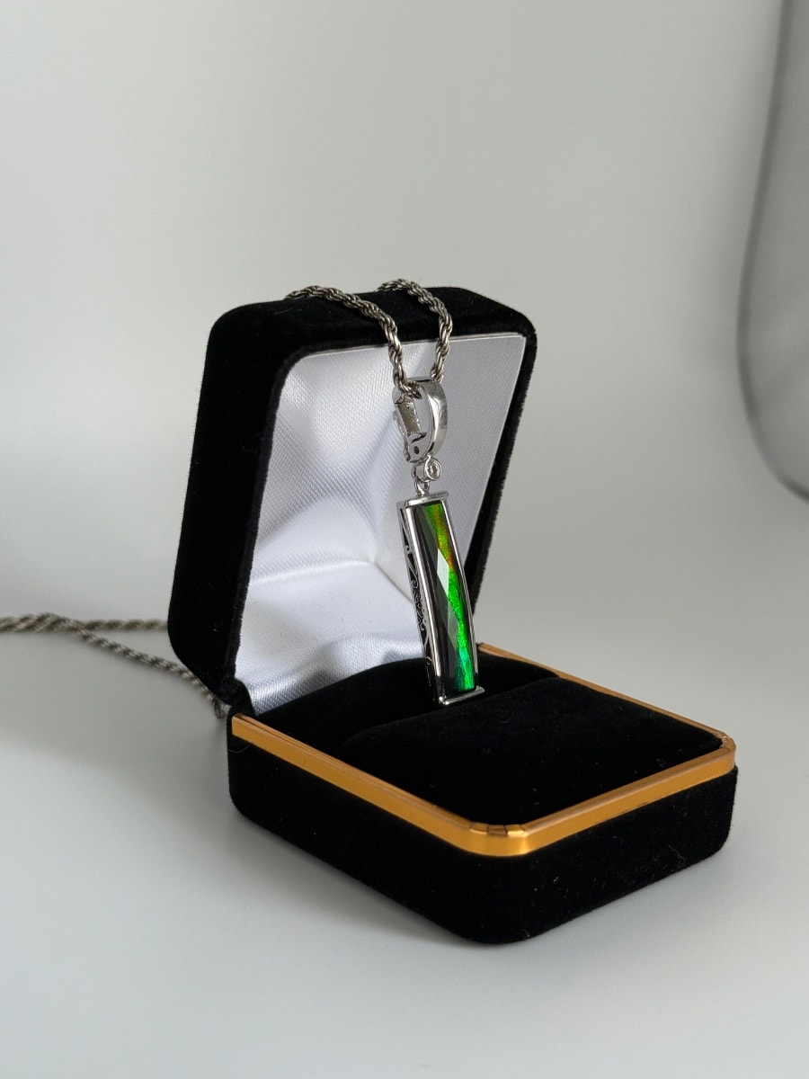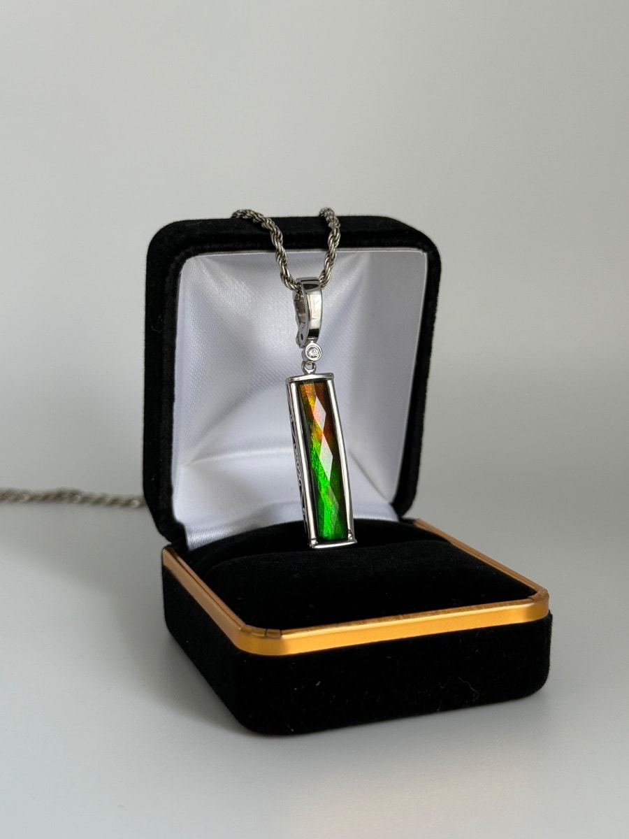 A striking rectangular pendant featuring a vibrant ammolite triplet set in .925 sterling silver with a faceted protective cap.