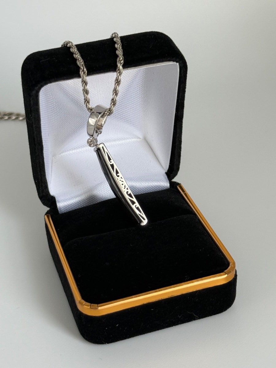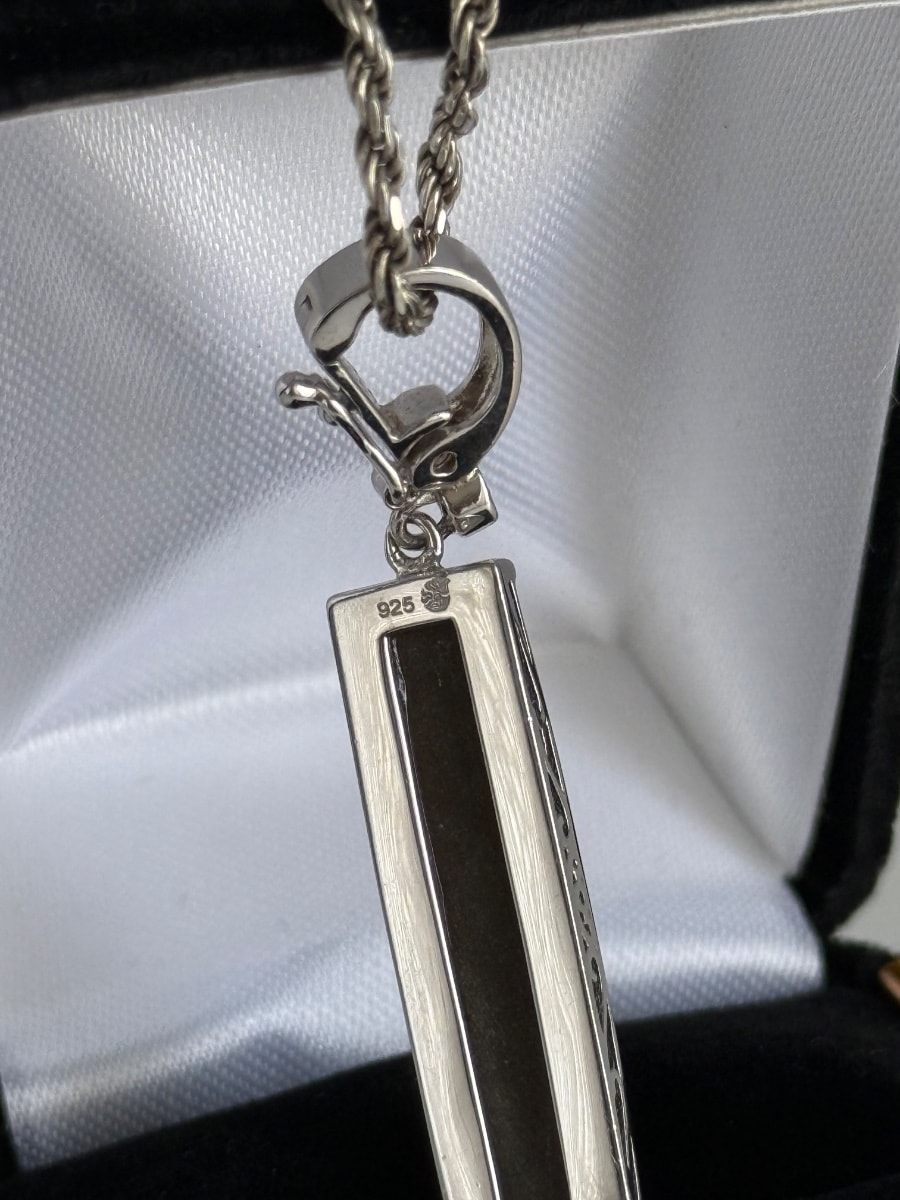 The pendant appears to be in excellent condition with sharp faceting on the cap and no visible delamination of the triplet. The silver shows very light surface wear consistent with gentle use. Excellent preservation of the iridescence maintains its full market value.