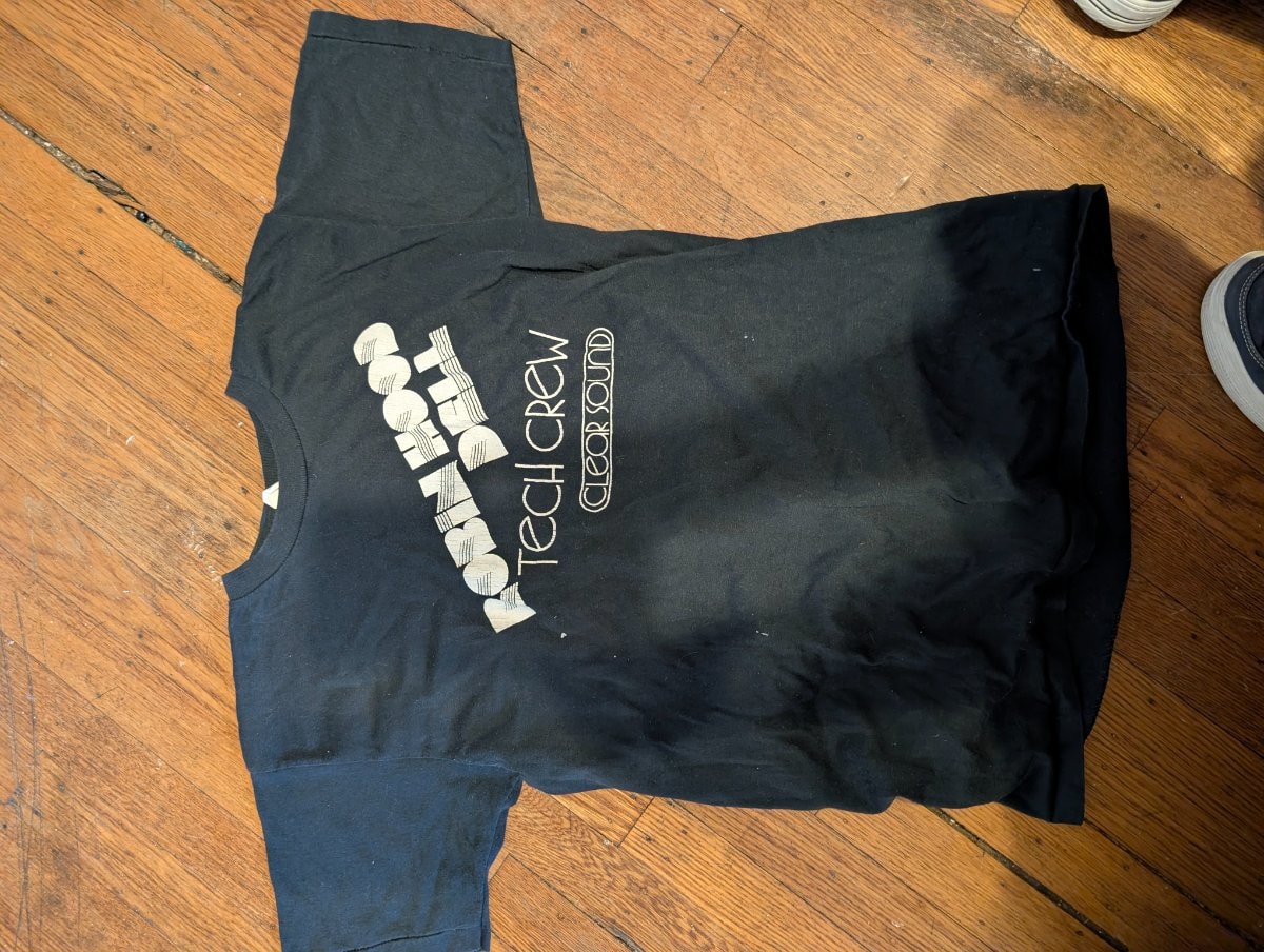 In 1976, Philadelphia celebrated the Bicentennial by opening 'Robin Hood Dell West,' a massive new outdoor venue. This shirt belonged to the invisible heroes behind the mixing board who ensured legends like James Taylor and Barry Manilow sounded perfect under the stars. By 1979, the venue was renamed the Mann Music Center, making 'Robin Hood Dell' tech gear a rare three-year relic.