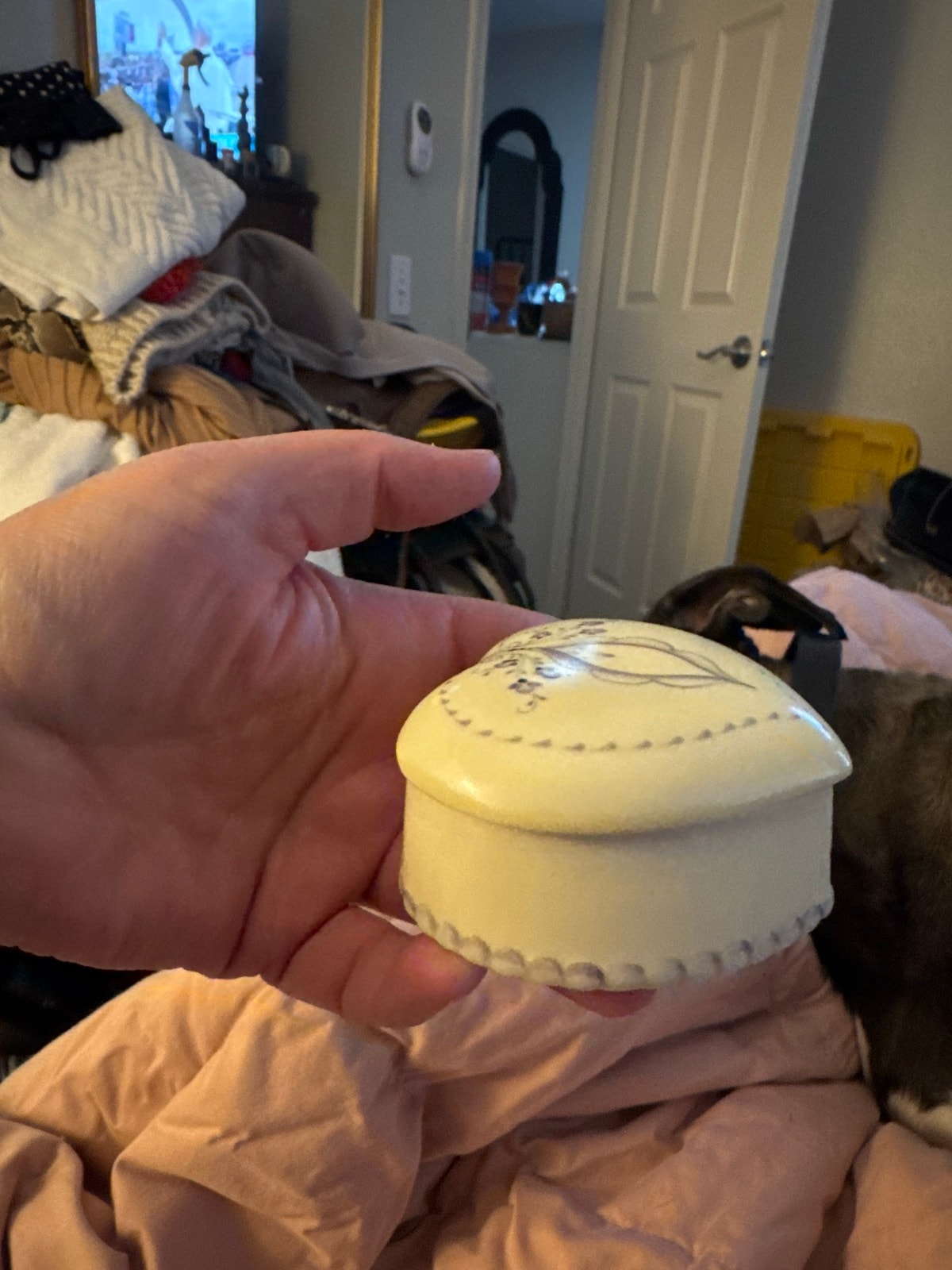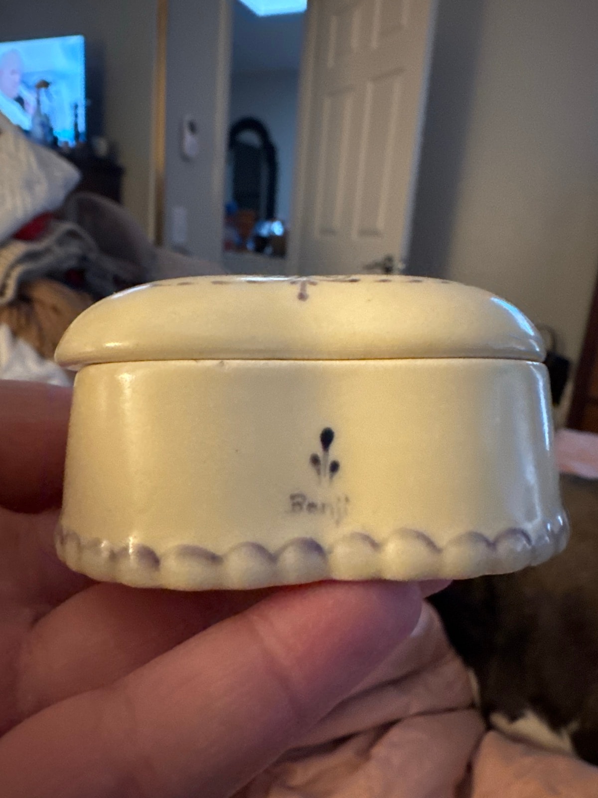 The box appears to be in excellent vintage condition with no visible chips or cracks in the glaze. The hand-painted design on the lid remains crisp and vibrant. Maintaining this condition is key, as chips in the scalloped base would significantly reduce its value.