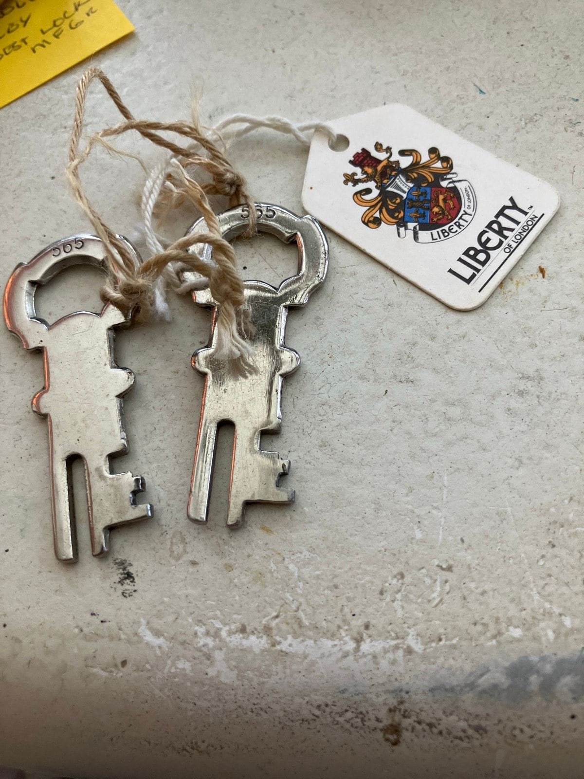 A pair of flat steel cabinet keys stamped with the code '565,' accompanied by an original Liberty of London swing tag. The tag features the Royal Coat of Arms, signifying the store's prestigious history and Royal Warrant status.