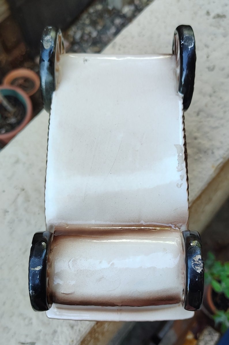The piece shows significant wear, particularly on the wheels where the dark overglaze has chipped or worn away, revealing the lighter clay body beneath. There is also some surface grime and minor abrasions consistent with age.
